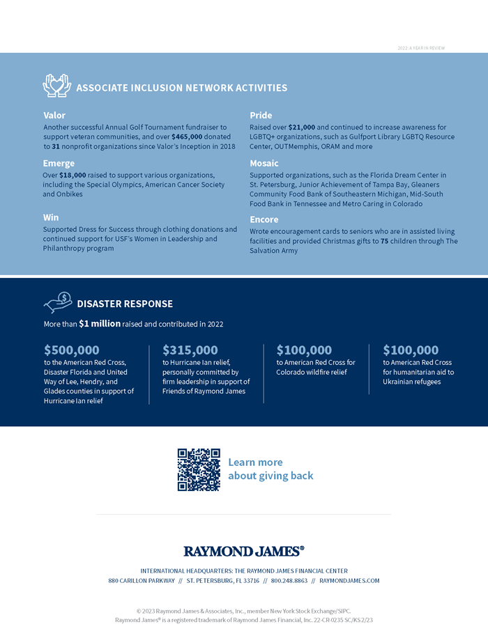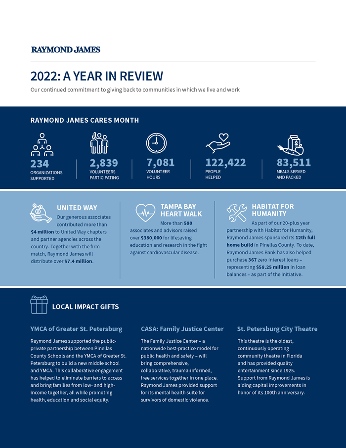 In 2022, we celebrated 60 years of Raymond James. Our offices across the United States, Canada and the UK lived up to our history – making an impact far beyond investing, giving back to the communities that have given us so much and, ultimately, empowering people to accomplish more. We’re in the business of helping people, and always have been. Explore our ongoing commitment to going forward by giving back.