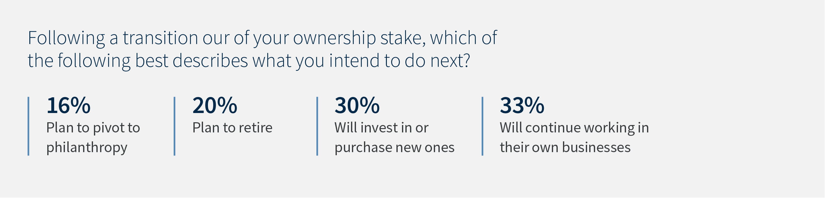 A majority see business ownership as a step, not a final goal. Only one-fifth of those surveyed saw retirement as their next step after exiting their ownership stake, in part or in whole. Nearly two-thirds in total intend to keep working at the business or to pursue a new business venture.
