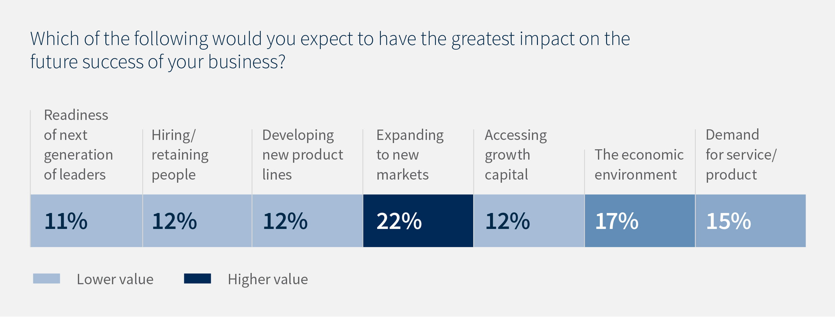 Owners weigh multiple factors that will influence the future success of their businesses. Expanding to new markets was identified as the most critical factor, garnering 22% of responses, though responses were evenly spread among several other potential challenges: economic environment (17%), demand for service/product (15%), hiring/retaining workers (12%), developing new product lines (12%), accessing growth capital (12%) and readiness of next generation of leaders (11%).